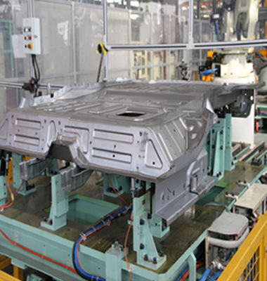 Punti culminanti di caso: 1. una produzione mista di tre tipi di assemblee del pavimento, compreso il pavimento della parte posteriore S7, M432 anteriore e posteriore pavimenta, assicura la commutazione flessibile dei dispositivi; 10 robot e 3 tavole di scivolamento.